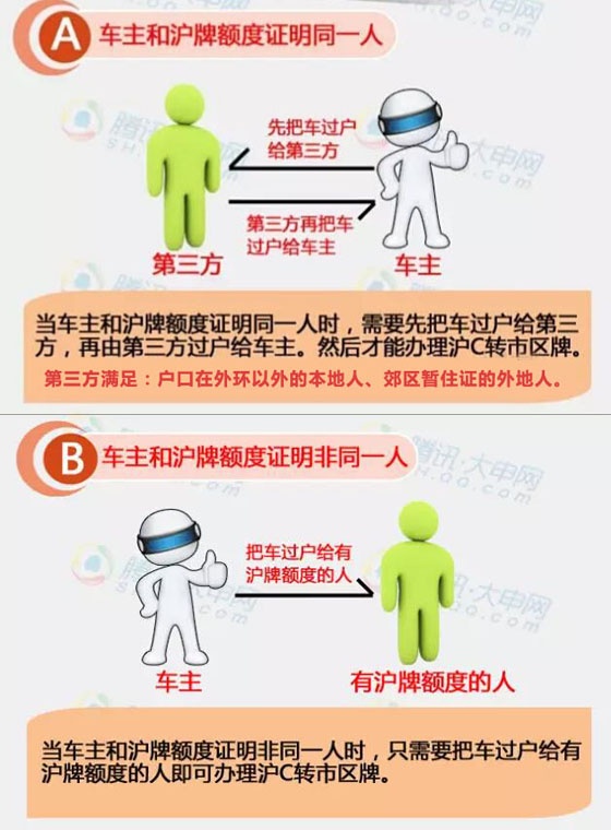 总结:当车主和沪牌额度证明非同一人时,只需要把车辆过户给有沪牌额度的人即可办理沪c转市区牌照。(下图演示)