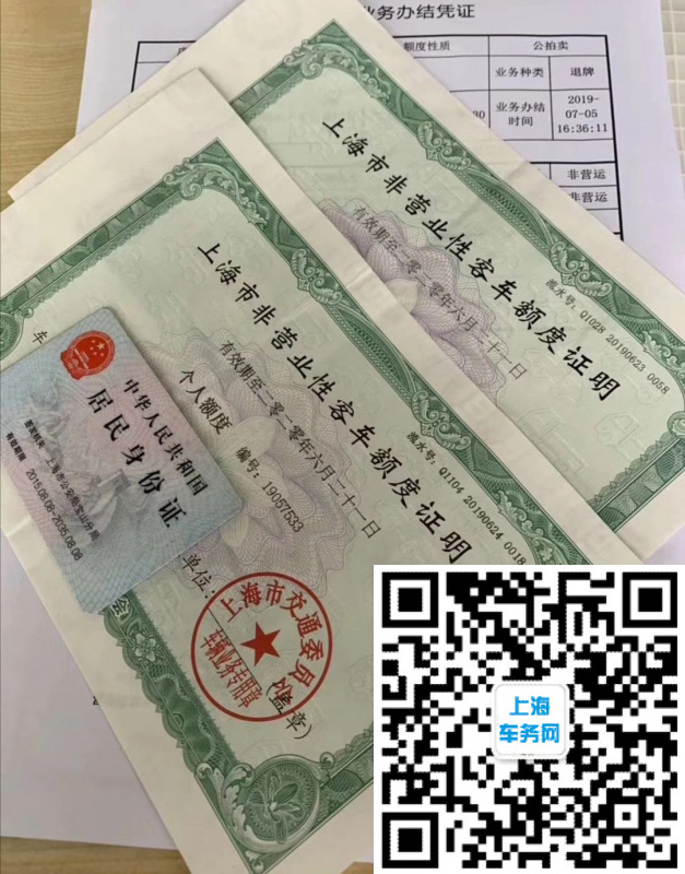 2、 旧车买卖退下来的办结凭证,有沪牌额度序号(类似身份证号)、原来车辆信息如车牌号码、车辆种类、车辆品牌、车辆所有人信息、办结时间等。官称:《机动车额度业务办结凭证》。