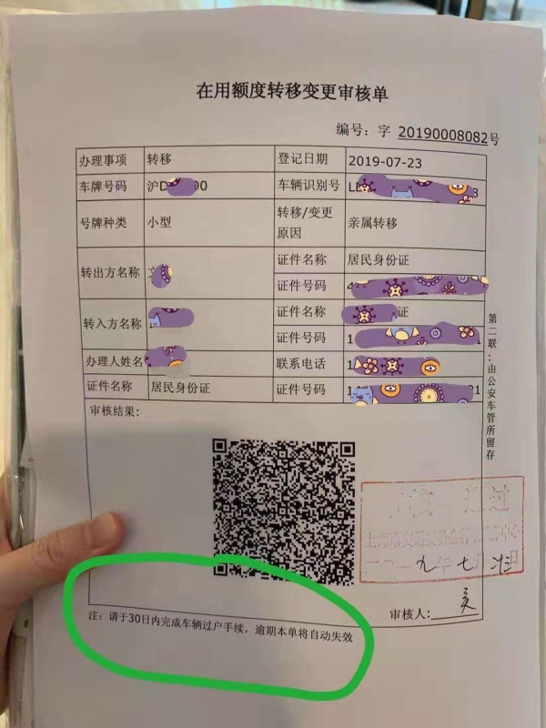 带好上面的资料就可认开具在用额度转移变更审核单了。然后带上上面的四个材料就可以进行正常的车辆过户了 电话微信:13601702302 。(审核通过后联系电话)
