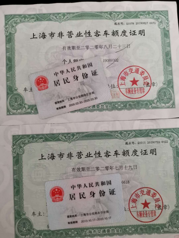 上海市非营业性客车额度证明 = 机动车额度业务办结凭证 (拿着凭证上牌)