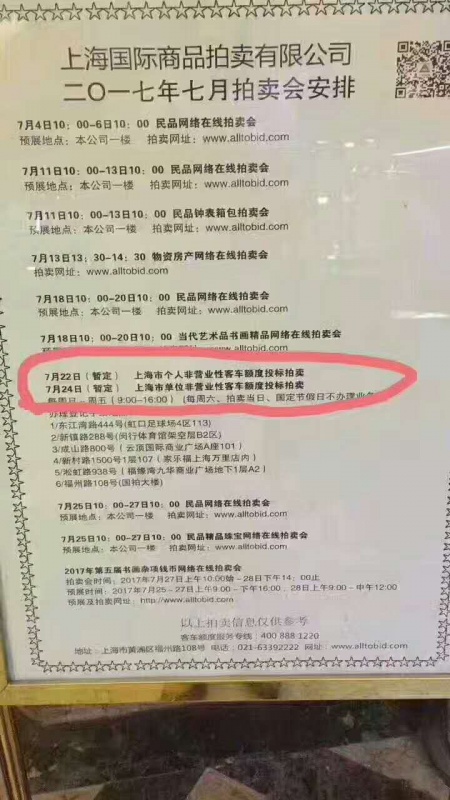 2017年7月上海车牌拍卖时间:7月22日 上海10:30 - 11:30分。 (下图)。 具体的拍牌攻略请咨询我们的在线客服。